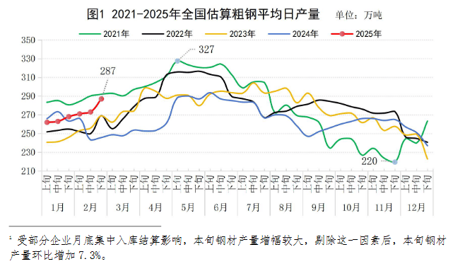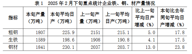 2025年2月下旬,重點統(tǒng)計鋼鐵企業(yè)共生產(chǎn)粗鋼1807萬噸,平均日產(chǎn)225.9萬噸,日產(chǎn)環(huán)比增長5.0%;生鐵1589萬噸,平均日產(chǎn)198.6萬噸,日產(chǎn)環(huán)比增長4.1%;鋼材1841萬噸,平均日產(chǎn)230.1萬噸,日產(chǎn)環(huán)比增長13.0%(見表1)1。