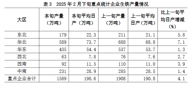 2月下旬六大地區(qū)重點統(tǒng)計企業(yè)生鐵日產(chǎn)量較上一旬均有不同程度增長(詳見表3),具體為: